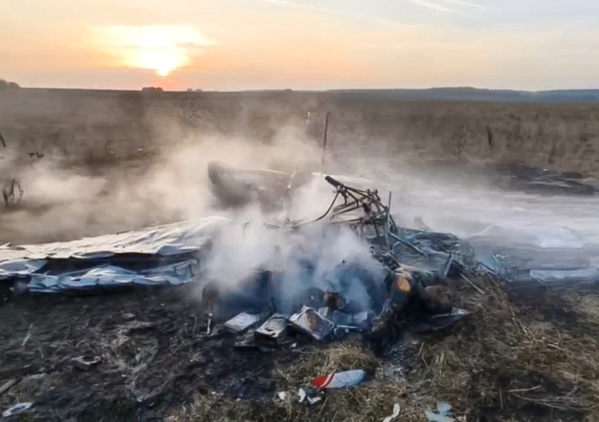 В Сети также появились фото и видео с места крушения. На них видны горящие обломки корпуса самолета и выжженная трава. Судя по кадрам, самолет полностью развалился, фрагменты воздушного судна разбросаны по всему полю.