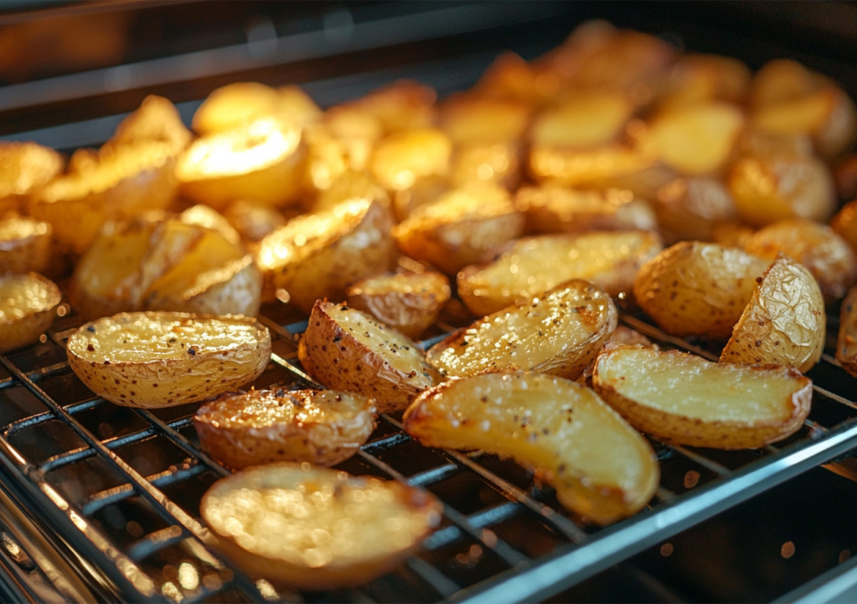 Главный секрет — в правильной подготовке. Картошку (лучше молодую) режем дольками прямо в кожуре — так она сохранит сочность. Смешиваем оливковое масло с раздавленным чесноком, розмарином и специями — получается ароматная заправка, в которой обваливаем каждую дольку. Выкладываем на противень в один слой — и в духовку на 40 минут при 200°C.