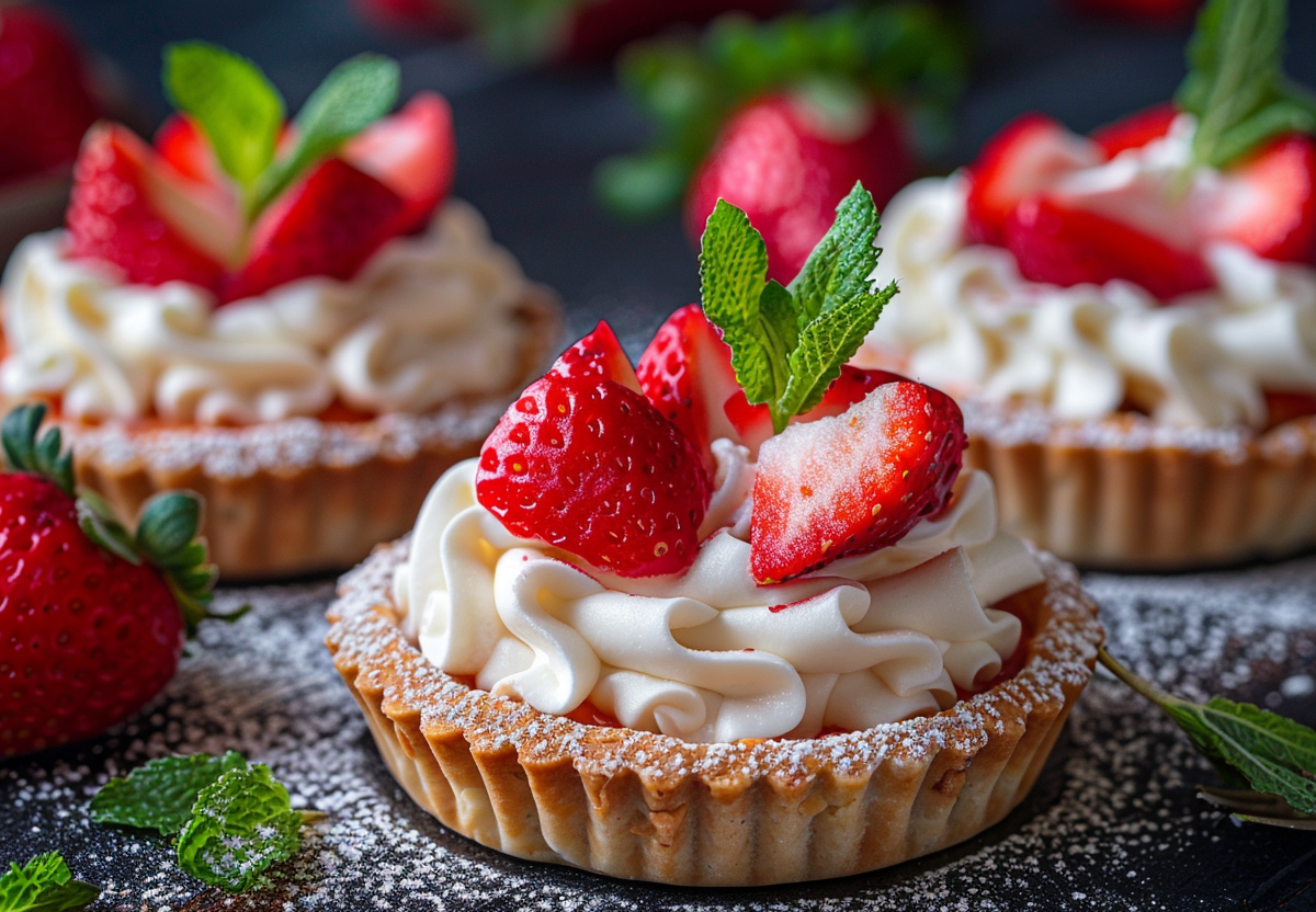 Хрустящие тарталетки с сочной клубникой — это нежный десерт, который покорит ваших гостей! Для приготовления понадобится 12 готовых песочных корзинок, 300 граммов свежей клубники, 200 миллилитров сливок (33%), 50 граммов сахарной пудры и чайная ложка ванильного экстракта.