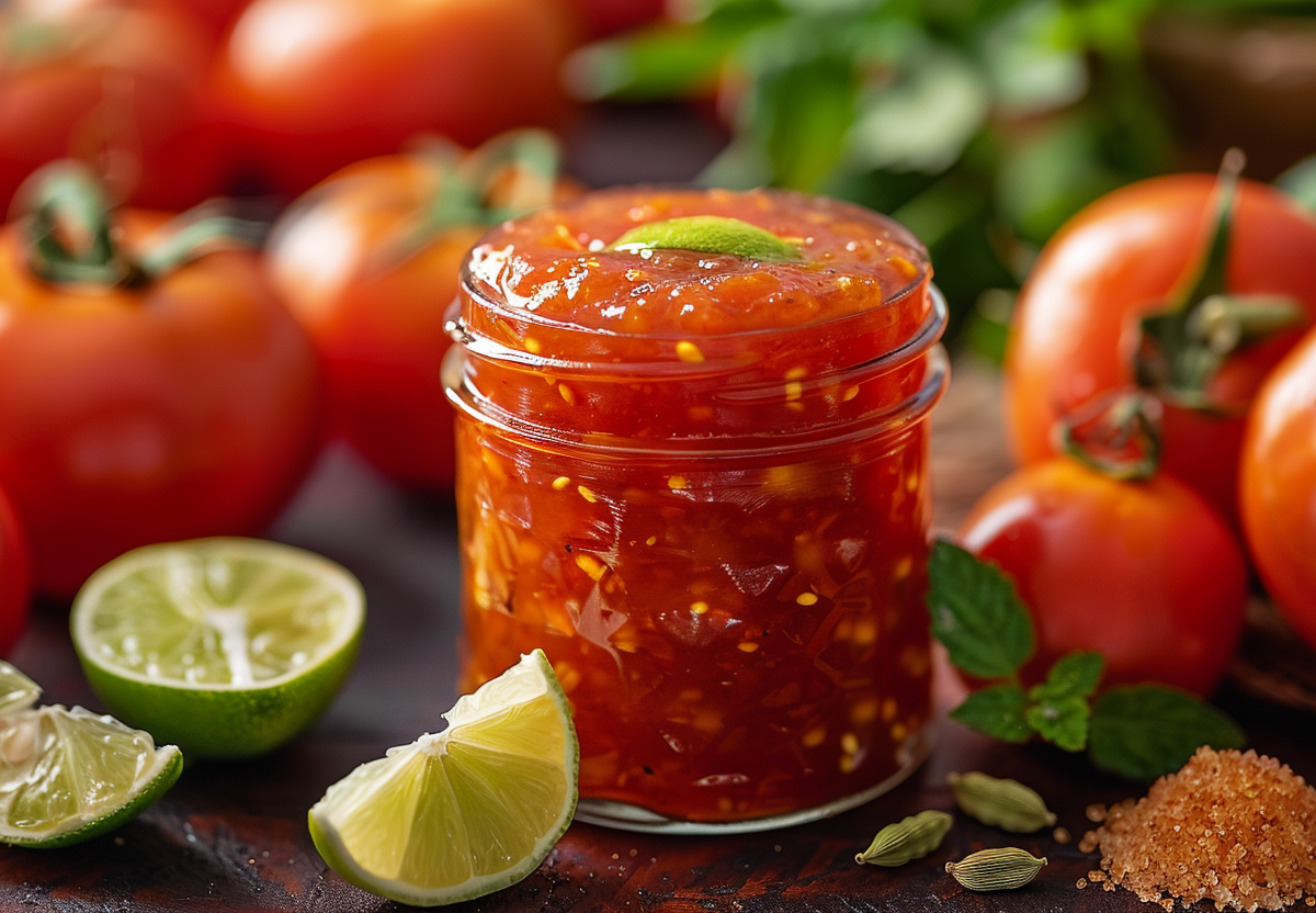 На 1 кг томатов нужны 900 г тростникового сахара (придает карамельный оттенок), сок и цедра 1 лайма (вместо лимона, для свежести), щепотка кардамона (для пикантности).