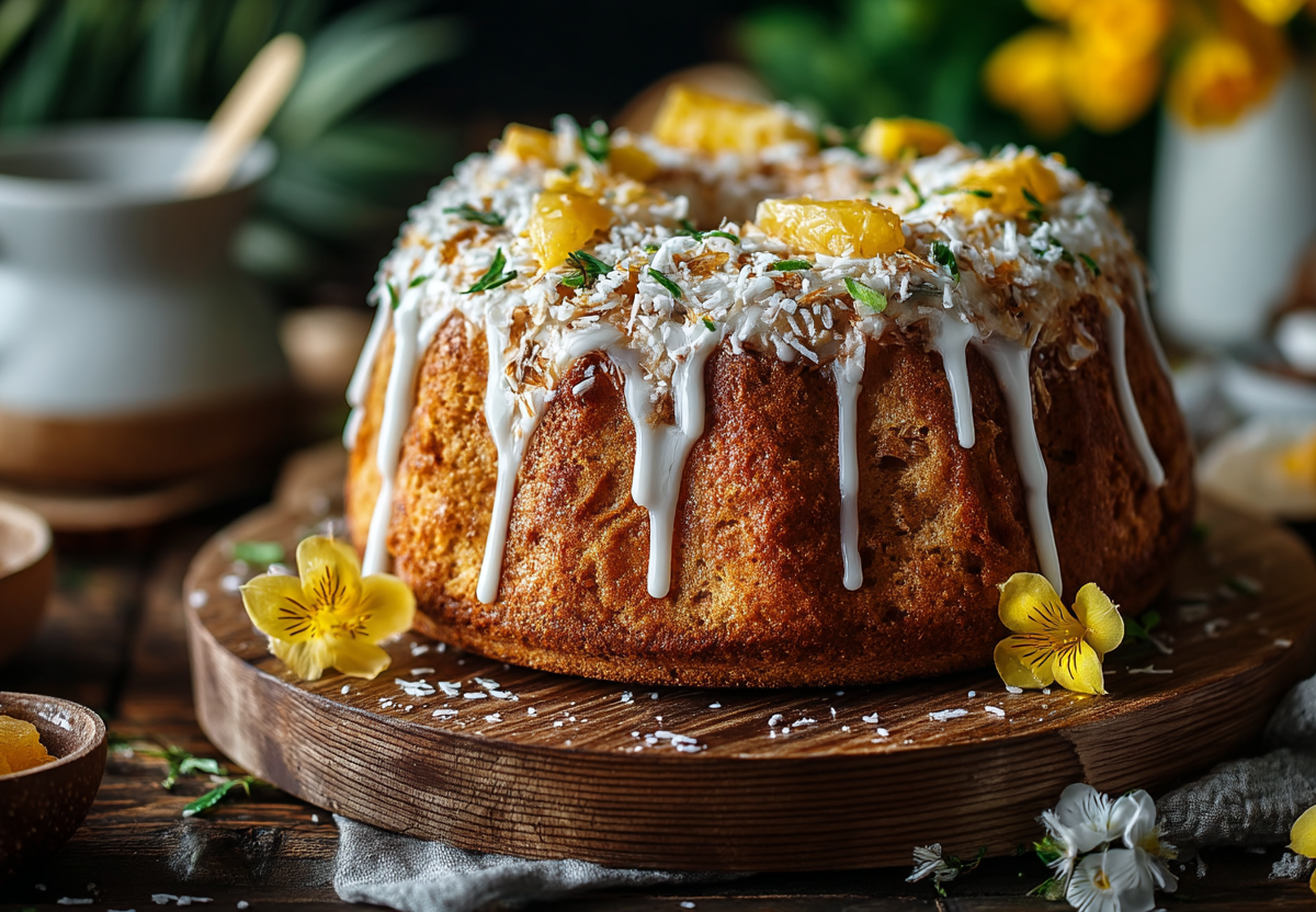 Накрываю и даю подойти до краев (30–40 минут). Выпекаю при 180 °C 40–45 минут до золотистого цвета. Готовность проверяю деревянной шпажкой. Остужаю на решетке. Украшаю глазурью, цукатами, кокосовой стружкой.