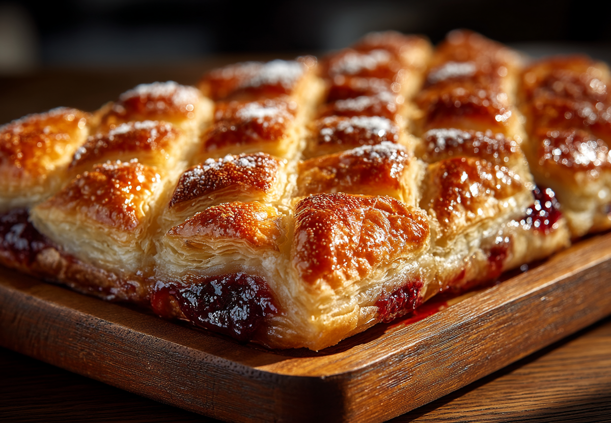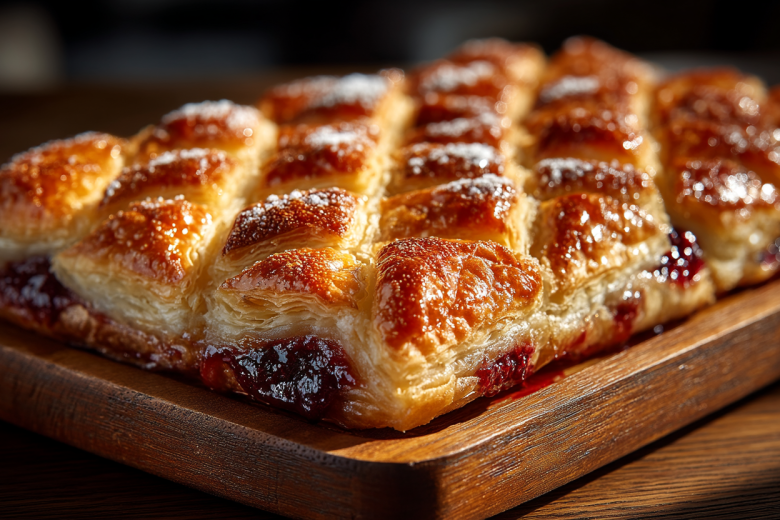 Рецепт: разморозьте тесто, слегка присыпьте стол мукой и раскатайте тесто в пласт толщиной 3–4 мм. Разрежьте его на два равных прямоугольника. Один прямоугольник выложите на противень, застеленный пергаментом. Равномерно распределите по нему варенье, отступая от краев 1–1,5 см. Накройте вторым прямоугольником теста. Вилкой плотно прижмите края, чтобы скрепить их. Острым ножом сделайте на верхнем слое неглубокие продольные надрезы, формируя ромбики или сеточку: это позволит пару выходить и украсит пирог. По желанию смажьте поверхность взбитым яйцом или молоком для румяной корочки. Выпекайте в разогретой до 200 °C духовке 20 минут до золотистого цвета.