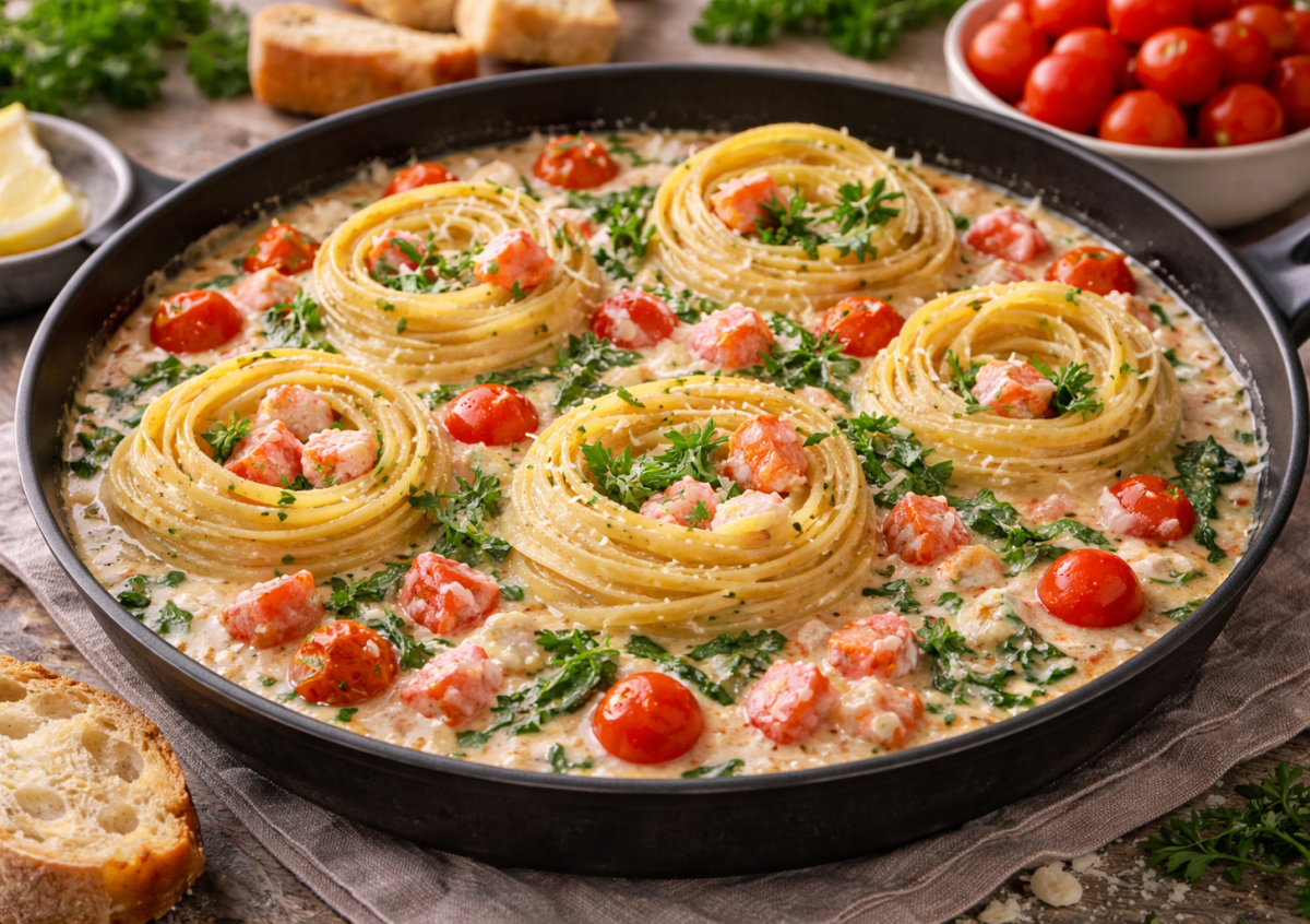 Как приготовить: в глубокой сковороде разогрейте сливочное и растительное масло. Добавьте разрезанные пополам помидоры черри. Всыпьте сушеный чеснок, добавьте шпинат и готовьте еще 1–2 минуты, пока он не осядет. Крабовые палочки нарежьте кусочками и выложите в сковороду, аккуратно перемешайте. Влейте сливки и воду (или бульон), посолите. Выложите макароны-гнезда прямо в соус, накройте крышкой и готовьте на среднем огне 10–12 минут, пока паста не станет мягкой. При необходимости подливайте немного жидкости. В конце добавьте тертый сыр, аккуратно перемешайте и прогрейте еще 1–2 минуты до кремовой консистенции.