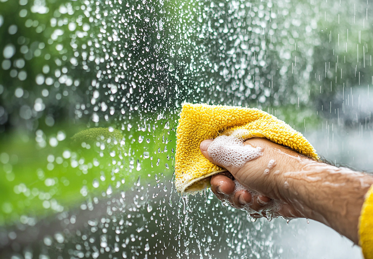 Наносите раствор пульверизатором, а вытирайте микрофиброй или каучуковым скребком — это исключит разводы.