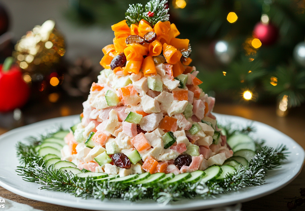 Новогодний стол — это всегда место для кулинарных экспериментов, где даже самое простое блюдо может заиграть новыми красками благодаря праздничной подаче. Салат «Простушка», несмотря на свое скромное название, это настоящая симфония вкусов: копченая курочка, ароматные грибы, сладковатый чернослив и хрустящие орехи. Но его главный секрет — тонкие яичные блинчики, которые заменяют традиционные слои и придают салату особую нежность. А если выложить его в форме нарядной елочки, украшенной ярким перцем и ягодами, он мгновенно превращается в центр всеобщего внимания и радости, который понравится и взрослым, и детям.