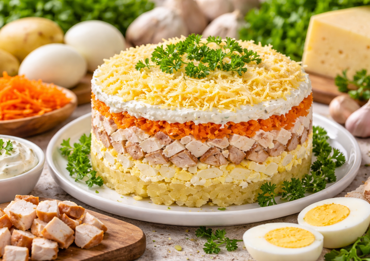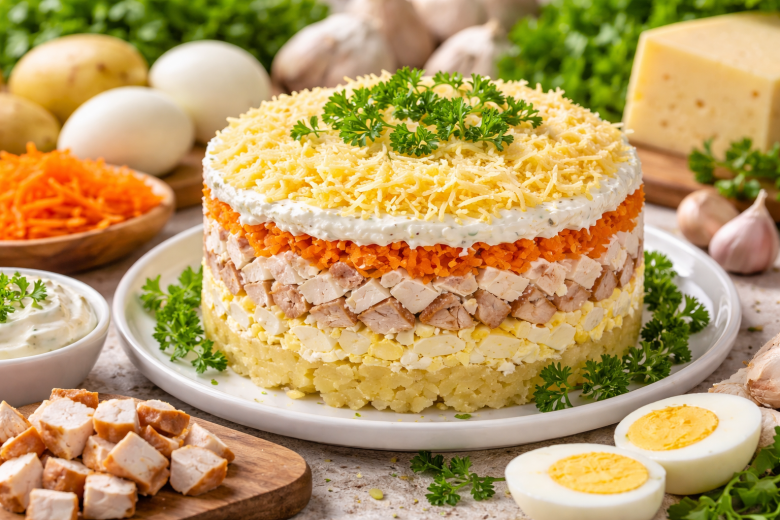 Картофель и морковь отвариваем, остужаем и натираем на крупной тёрке, яйца также натираем, грудку режем мелкими кубиками, лук измельчаем максимально мелко. Для заправки смешиваем йогурт, горчицу и чеснок — получается лёгкий соус с ярким вкусом. Выкладываем слоями: картофель, яйца, грудка, лук, морковь, каждый слой слегка промазываем соусом, картофель лучше немного перемешать с заправкой. Солим овощные слои, сверху посыпаем тёртым сыром. Даём настояться 1–2 часа — и подаём. Калорийность: примерно 120–140 ккал на 100 г.