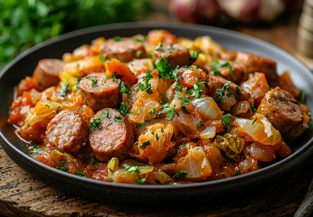 Вкус этого блюда — это гармоничное сочетание сладковатой, нежной и ароматной тушеной капусты с пикантными и сочными сосисками. Это простое в приготовлении и очень экономичное блюдо точно станет частым гостем на вашем столе.