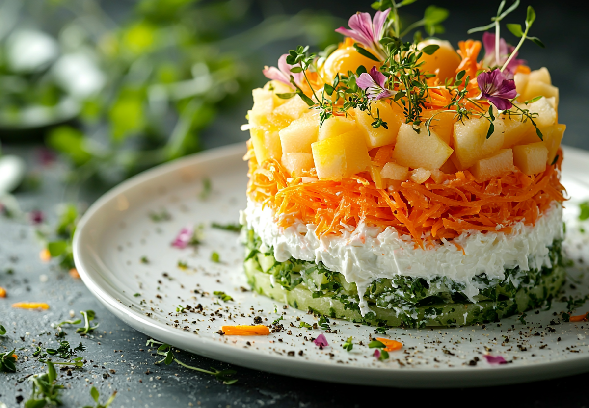 Немудреный салат «Французский» с морковью! 4 ингредиента и он на столе! Классическая слоёная закуска с идеальным балансом сладкого и солёного. Этот элегантный салат сочетает свежесть яблок, нежность яиц и пикантность сыра. Простота приготовления и эффектная подача делают его идеальным для праздничного стола.