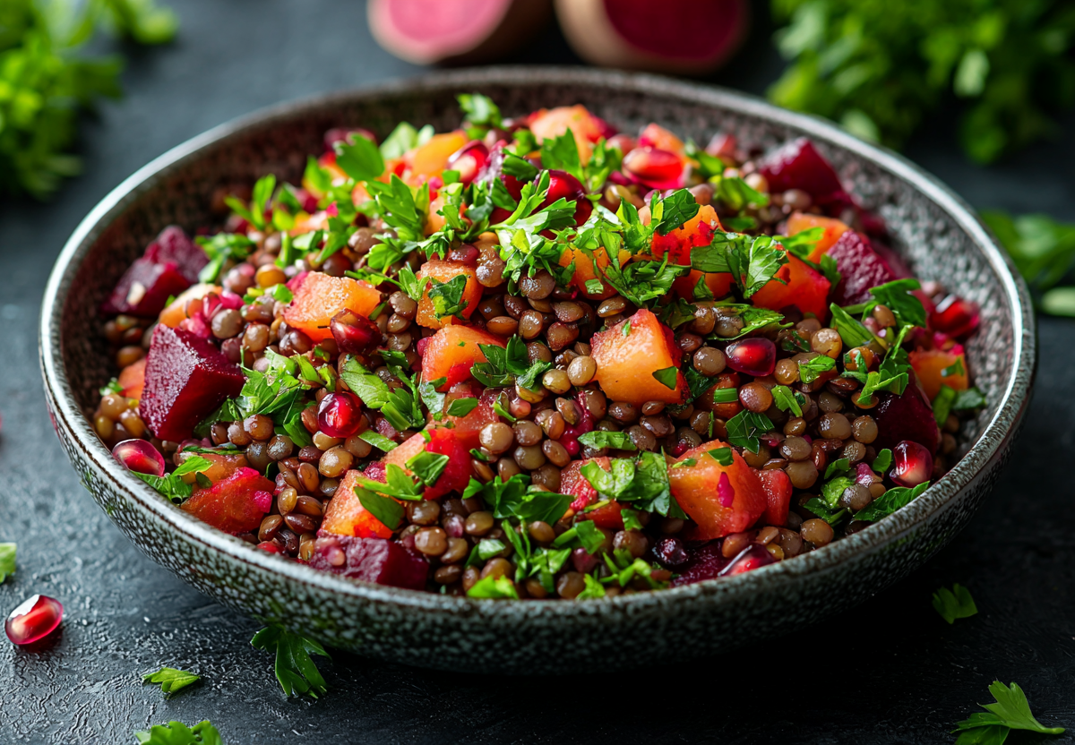 Этот салат я открыл для себя, когда искал полезную альтернативу привычным блюдам. Сочетание хрустящей чечевицы с нежной свеклой и зернами граната оказалось настолько гармоничным, что теперь это мой любимый вариант для легкого ужина. Блюдо получается не только вкусным, но и невероятно полезным.