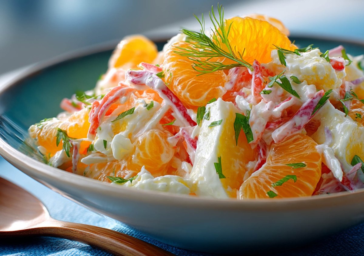 Иногда достаточно одного ингредиента, чтобы привычное блюдо заиграло по-новому. В этом салате такую роль играет апельсин — он придает свежесть и легкую сладость. Закуска получается сочной, яркой и идеально подходит как для будней, так и для праздника.