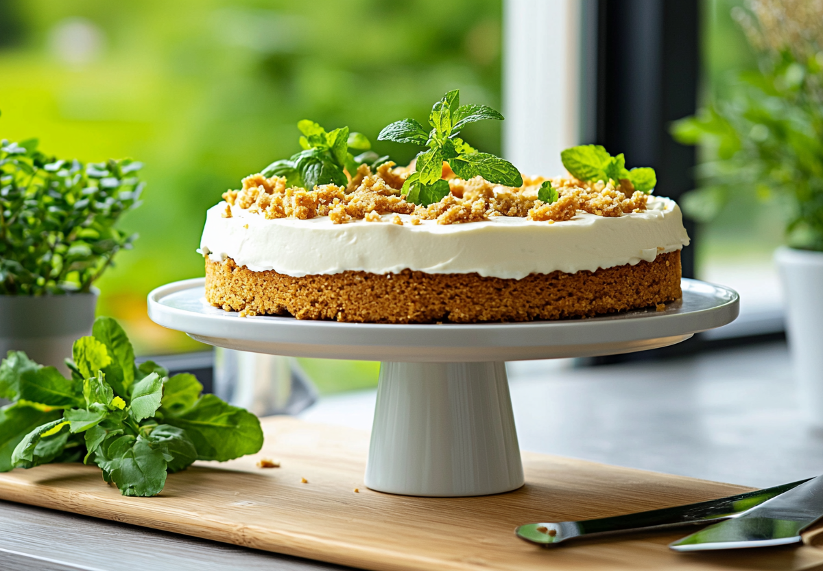 4. Дайте пирогу остыть, затем смажьте творожной начинкой и посыпьте орехами.
