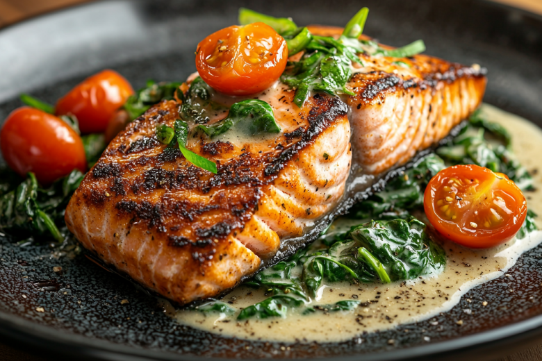 Для блюда мне нужно: стейки семги (2 шт.), сливки 10% (100 мл), шпинат (40 г), помидоры черри (100 г), чеснок (2 зубчика), соль и перец по вкусу. Готовлю так: семгу слегка обжариваю с двух сторон на оливковом масле, затем перекладываю на тарелку. В той же сковороде пассерую измельченный чеснок, добавляю разрезанные пополам помидоры черри и шпинат. Когда шпинат немного увянет, вливаю сливки, прогреваю 2-3 минуты и возвращаю семгу в соус. Томлю под крышкой еще 5–7 минут на медленном огне. Подаю с рисом или молодой картошкой.