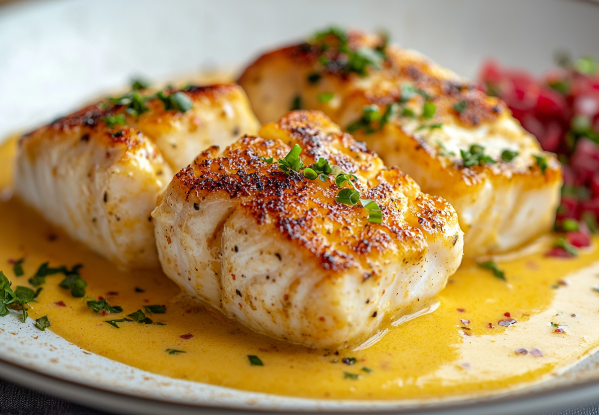Рыбу обсушите, обваляйте в муке и быстро обжарьте до золотистой корочки. Залейте подготовленным соусом, добавьте 220 мл сливок и доведите до лёгкого кипения. Важный секрет — выключайте плиту сразу же, как соус начнёт булькать, чтобы рыба осталась сочной.