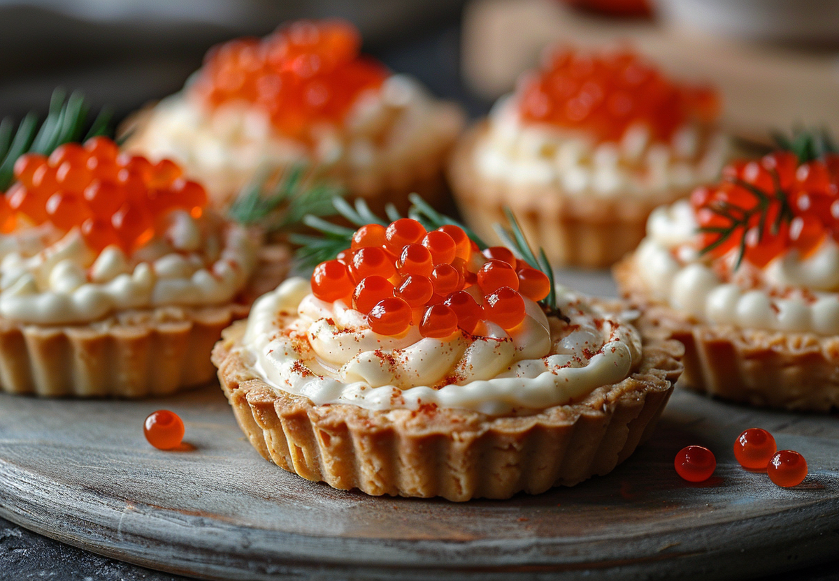 Попробуйте украсить праздничный стол новогодними тарталетками с красной икрой и сырным кремом. Хрустящая основа из песочного теста в сочетании с нежнейшей начинкой подарят истинное удовольствие.
