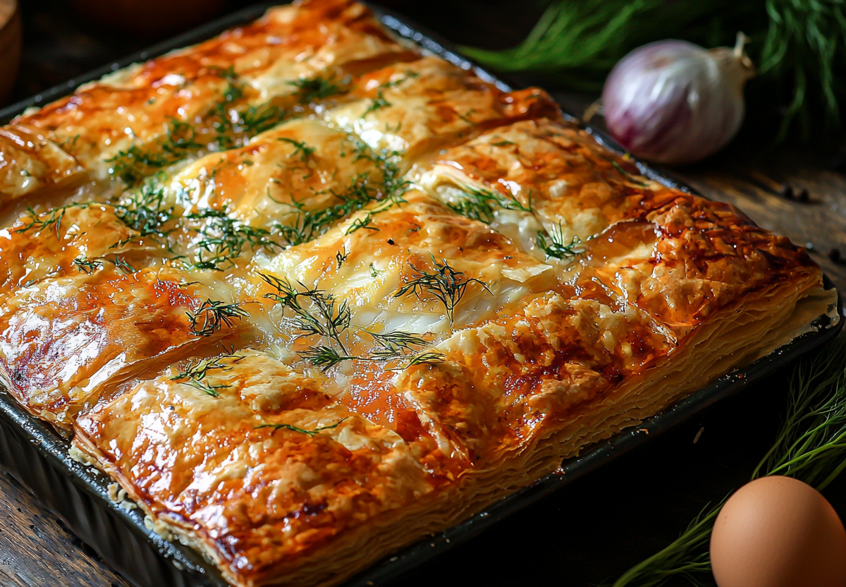 Вам понадобится: 500 г слоеного теста, 400 г филе минтая, 1 луковица, 2 яйца, 3 ст. л. сметаны, зелень укропа, соль и перец. Разморозьте тесто по инструкции. Лук нарежьте полукольцами, филе — кусочками. Смешайте рыбу с луком, измельченным укропом, сметаной и сырым яйцом. Посолите и поперчите. Раскатайте один пласт теста, выложите в форму, сделав бортики. Равномерно распределите начинку. Накройте вторым пластом, защипите края. Смажьте взбитым яйцом и выпекайте 35–40 минут при 180 °C до золотистого цвета. Дайте немного остыть перед нарезкой.