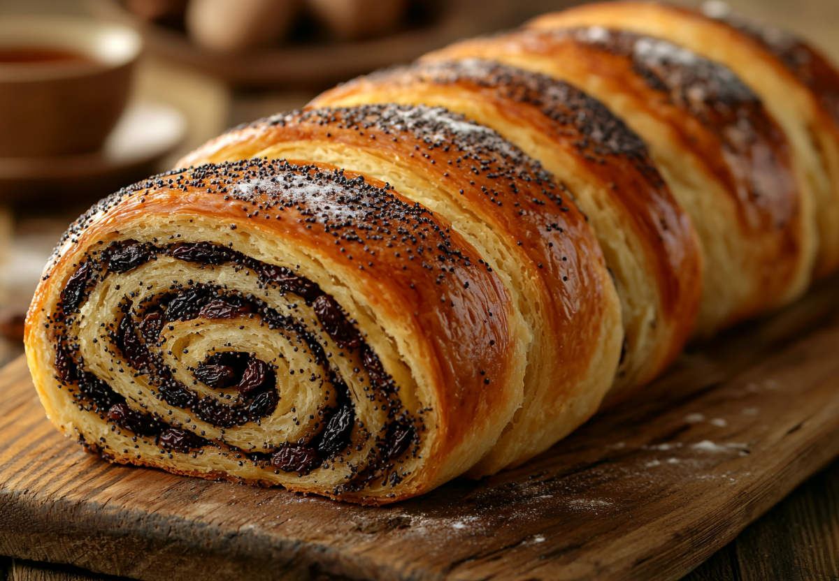 - Раскатайте тесто в прямоугольный пласт (30×20 см). Равномерно распределите маковую начинку, отступая 2 см от краев. Аккуратно сверните. Смажьте взбитым яйцом или молоком. Выпекайте в разогретой до 180 °C духовке 40–45 минут до золотистой корочки.