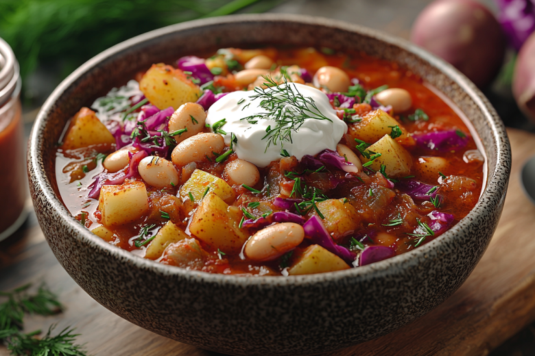 Рецепт: свеклу и морковь нарежьте соломкой, лук — кубиками. Обжарьте лук до прозрачности, добавьте морковь и свеклу, тушите 7–10 минут. Влейте 1 ст. л. уксуса или сока лимона, чтобы свекла сохранила цвет, добавьте томатную пасту, перемешайте и снимите с огня. В кипящую воду (2,5 л) отправьте нарезанный картофель, через 10 минут добавьте нашинкованную капусту. Когда овощи станут мягкими, добавьте зажарку и промытую фасоль. Посолите, поперчите, добавьте лавровый лист и варите 5–7 минут. В конце введите измельченный чеснок и зелень. Дайте настояться под крышкой 20–30 минут.