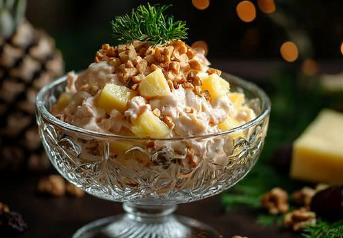 Для приготовления вам понадобится: 300 г копченой курицы, банка консервированных ананасов, 150 г чернослива, стебель лука-порея, 100 г грецких орехов, 150 г мягкого сыра и майонез для заправки. Курицу нарежьте кубиками, ананасы откиньте на дуршлаг и немного обсушите. Чернослив залейте кипятком на 10 минут, затем нарежьте соломкой. Лук-порей нашинкуйте тонкими кольцами, сыр натрите на крупной терке, орехи слегка обжарьте и порубите. Все ингредиенты аккуратно смешайте в миске, заправляя майонезом. Дайте салату настояться в холодильнике хотя бы час — это позволит вкусам идеально соединиться. Подавайте, украсив веточкой зелени или дольками ананаса.