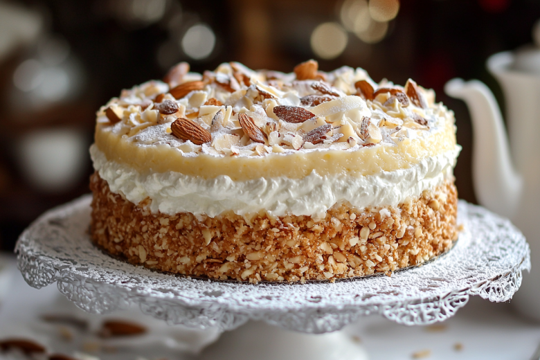 Для приготовления вам понадобится: для ванильного бисквита: 3 яйца, 100 г сахара, 90 г муки, щепотка ванилина. Для шоколадного бисквита: те же ингредиенты плюс 20 г какао. Для крема: 250 г сливочного масла, 150 г сахарной пудры, 100 г молотого миндаля (или миндальной муки), 2-3 ст. л. молока. Раздельно взбейте яйца с сахаром для двух видов теста, аккуратно вмешайте муку. Выпеките два тонких коржа разных цветов. Для крема взбейте мягкое масло с сахарной пудрой, добавьте молотый миндаль и молоко для нужной консистенции. Коржи разрежьте пополам. Собирайте торт, чередуя шоколадные и ванильные коржи и обильно промазывая их кремом. Внешнюю сторону торта также покройте кремом. Дайте настояться в холодильнике 6–8 часов. Украсьте тертым шоколадом или цельным миндалем.
