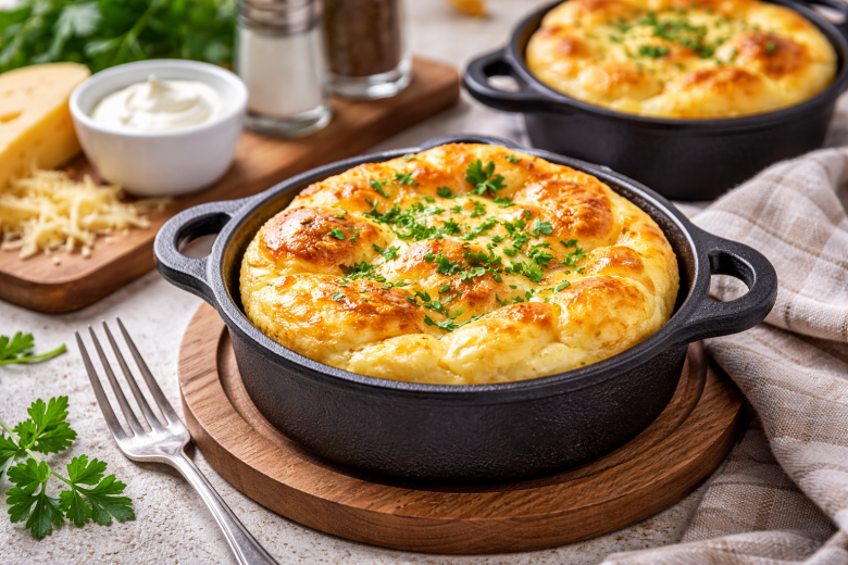 Приготовление: сыр натираем на тёрке. Яйца аккуратно разделяем на желтки и белки. К желткам добавляем сметану, муку, тёртый сыр и соль, хорошо перемешиваем до однородности. Белки взбиваем до устойчивой пены и осторожно вмешиваем в основную массу, чтобы сохранить воздушность. Формочки или небольшие сковородки смазываем сливочным маслом, раскладываем омлетную смесь и отправляем в разогретую духовку. Запекаем до золотистой корочки — омлет увеличится в объёме почти вдвое и станет пышным. Подавать лучше сразу: при длительном хранении он оседает и теряет сочность.