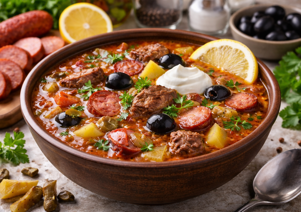 Дайте солянке покипеть ещё 5–10 минут. Подавайте горячей с маслинами, ломтиком лимона и ложкой сметаны.