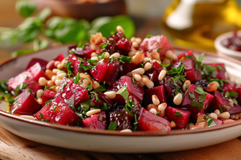 Получается обалденная вкуснятина: сочные брусочки свеклы, ароматная заправка с чесноком и травами, хрустящие орешки и тонкая кислинка лимона — все вместе создает взрыв вкуса, от которого невозможно оторваться.