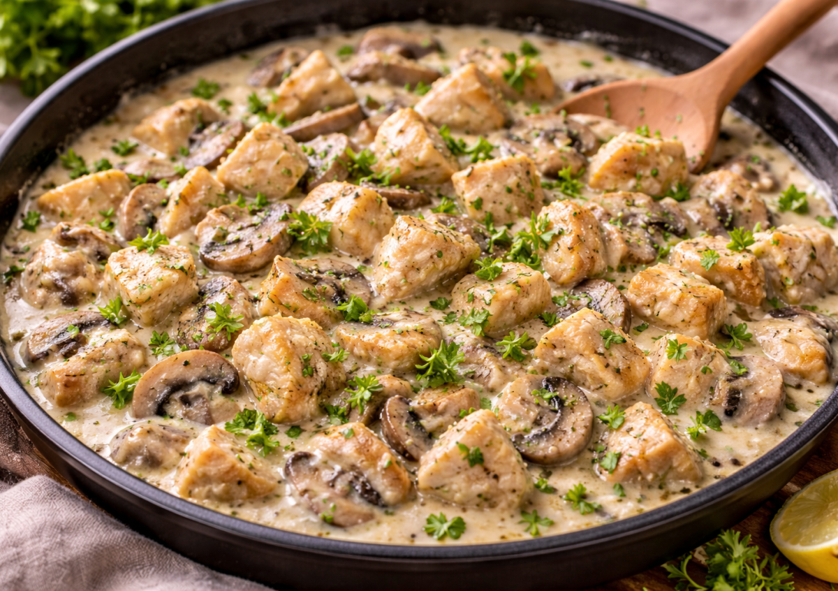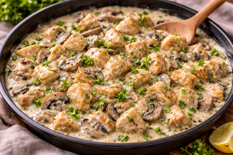 Иногда хочется приготовить что-то уютное и домашнее, но без сложных техник и долгой готовки. В такие моменты выручает фрикасе из курицы — мягкие кусочки мяса, шампиньоны и густой сливочный соус. Блюдо получается невероятно нежным и ароматным, а готовится гораздо проще, чем кажется. Многие считают его отличной альтернативой привычному гуляшу: вкус более мягкий, а текстура кремовая и бархатистая.