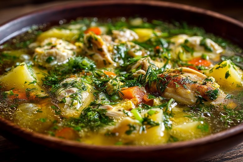 Для приготовления вам понадобится: 2 куриных окорочка или грудки, 3 яйца, 1 луковица, 1 морковь, 2–3 картофелины, пучок свежей зелени (укроп, петрушка, зеленый лук), 1 столовая ложка соли, черный перец по вкусу, лавровый лист. Курицу залейте 2 литрами холодной воды, доведите до кипения, снимите пену, добавьте целую луковицу и морковь, варите 30 минут. Картофель нарежьте кубиками, добавьте в бульон.