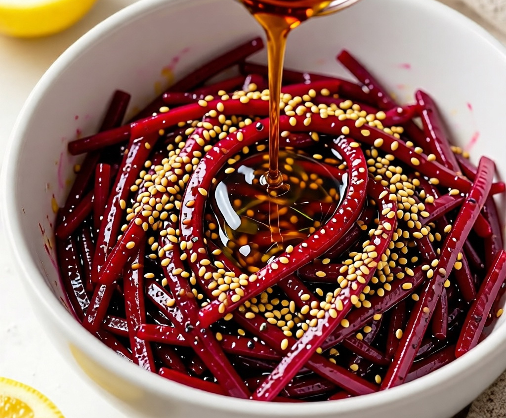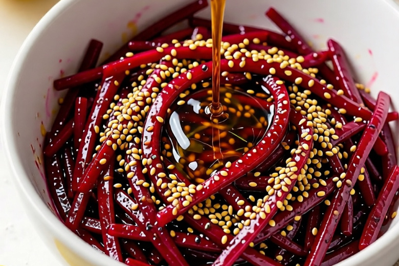 Получается обалденная вкуснятина: тонкая соломка свеклы, пропитанная ароматным маслом с легкой кислинкой и остринкой чеснока, с хрустящими нотками кунжута. Салат настолько яркий и сочный, что затмевает привычный винегрет и исчезает со стола быстрее, чем вы успеваете его перемешать.
