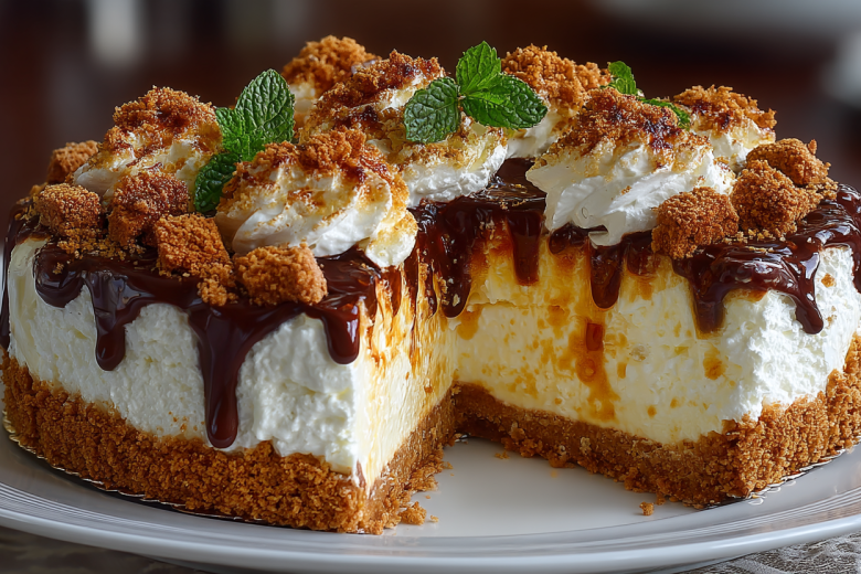 Разъемную форму застелите бумагой для выпечки, высыпьте половину крошки, разровняйте. Сверху выложите весь сливочный крем, разгладьте. Посыпьте оставшейся крошкой — можно только края для эффектной подачи. Уберите торт в холодильник на 2–3 часа, затем переставьте в морозилку еще на 2 часа. Перед подачей украсьте ягодами и мятой. Этот десерт станет звездой любого чаепития.