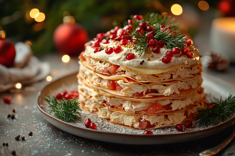Сборка нашего торта — это настоящее удовольствие! На первый белковый блин мы выкладываем часть нарезанной курицы, слой кружочков помидоров и щедро поливаем йогуртовой заправкой. Накрываем следующим блинчиком и повторяем слои. Самый верхний ярус украшаем веточками укропа и яркими гранатовыми зернами для новогоднего настроения. Обязательно даем торту настояться в холодильнике 2–3 часа — тогда все вкусы чудесным образом соединятся в идеальную гармонию.