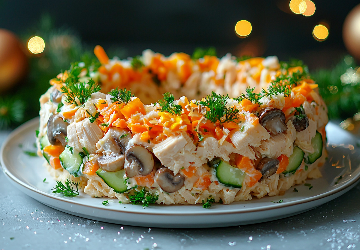 Новогодний салат «Хоровод» с грибами: простой рецепт, который точно приживется у каждой хозяйки. Ищете салат, который гарантированно понравится всем? Это блюдо с нежной курицей, хрустящими огурцами и ароматными грибами станет настоящим хитом вашего застолья! Удачное сочетание знакомых ингредиентов в новом исполнении не оставит никого равнодушным.