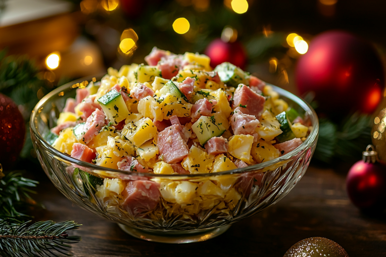 Ингредиенты остаются простыми и доступными: 100 г ветчины, 1–2 отварных картофелины, 2–3 яйца, 50 г твёрдого сыра, по 50 г свежего и маринованного огурца, горошек по вкусу, 1 ч. л. горчицы, 1–2 ст. л. жирных сливок, по желанию 1 ст. л. майонеза, соль и перец по вкусу. Все продукты нарезаются мелким кубиком, смешиваются в глубокой миске, затем заправляются смесью сливок, горчицы и, при необходимости, небольшого количества майонеза. Такая заправка делает салат нежным и кремовым, но не тяжёлым. Получается свежий, контрастный по текстуре и очень праздничный салат, который легко станет фаворитом на новогоднем столе.