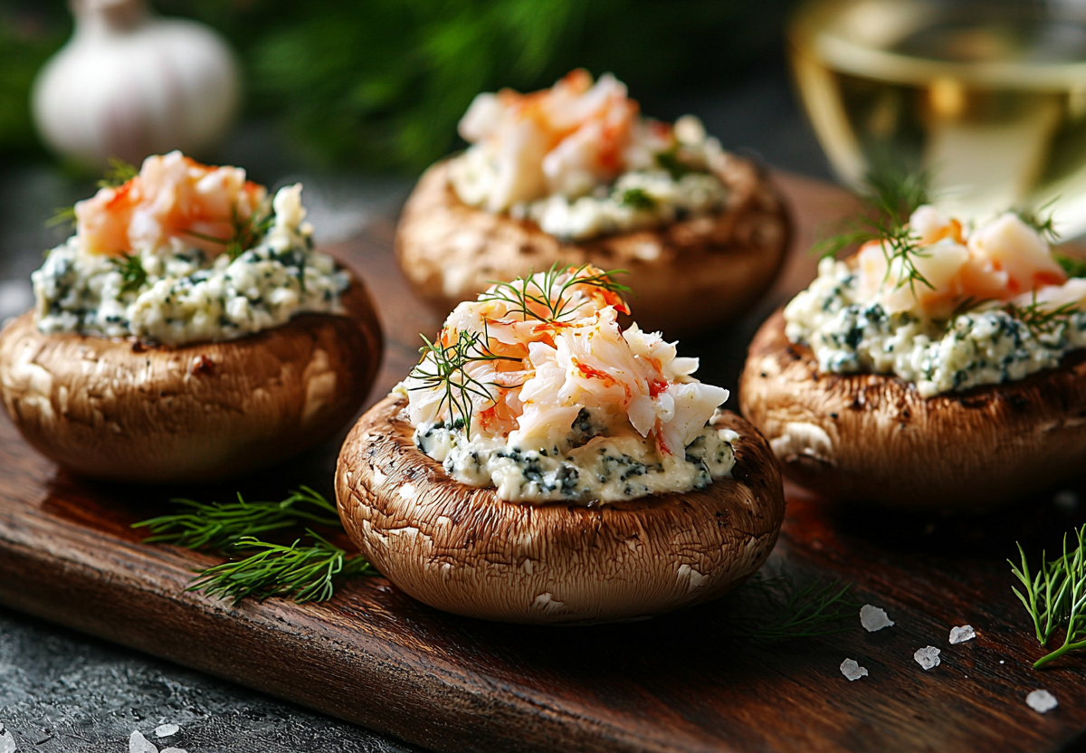 Пока грибные шляпки в духовке, натираем 120 г твердого сыра и мелко рубим 100–120 г крабовых палочек. Добавляем один измельченный зубчик чеснока и перемешиваем — получается нежная, тягучая начинка с легким морским ароматом. Достаём шампиньоны, плотно наполняем каждой шляпку начинкой и снова отправляем в духовку на 8–10 минут, пока сыр сверху не подрумянится. Подавайте горячими — эти новогодние мини-закуски исчезают со стола первыми!