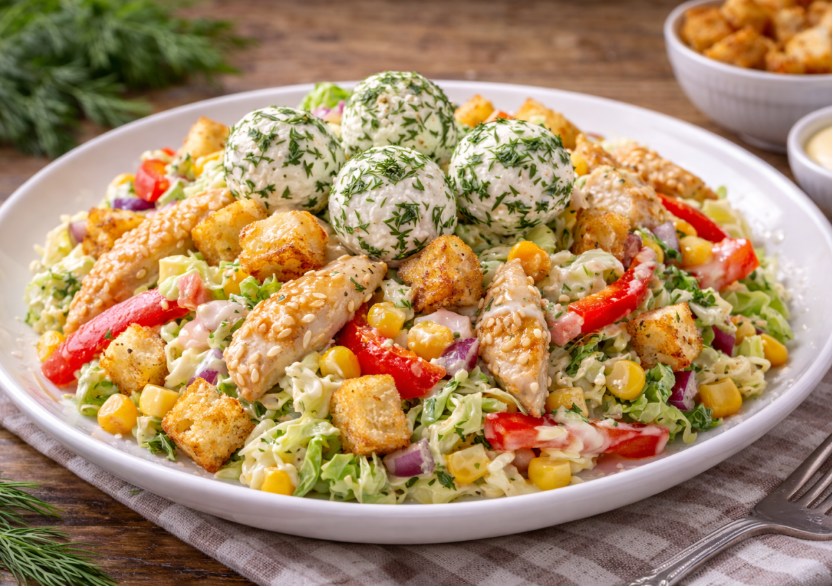 Приготовление: батон нарезают кубиками, смешивают с маслом, чесноком и травами, запекают при 160–170 °C 15–20 минут до хруста. Куриное филе нарезают полосками, солят, перчат, посыпают кунжутом и обжаривают на сильном огне 5–7 минут до сочности. Капусту шинкуют, перец нарезают соломкой, лук мелко режут. Для шариков сыр смешивают с чесноком, укропом и базиликом, формируют небольшие шарики. Для заправки соединяют майонез, соевый соус, чеснок и мандариновый сок. В миске смешивают овощи, кукурузу и курицу, выкладывают на тарелку, сверху добавляют сырные шарики и крутоны, поливают соусом.