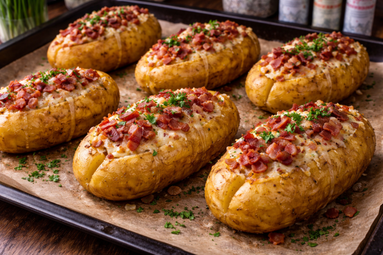 Иногда самые простые продукты дают самый эффектный результат. Эта картошка — именно такой случай: румяная снаружи, мягкая внутри, с ароматным беконом и расплавленным сыром. Отлично подойдёт и на ужин, и как горячее блюдо на стол.