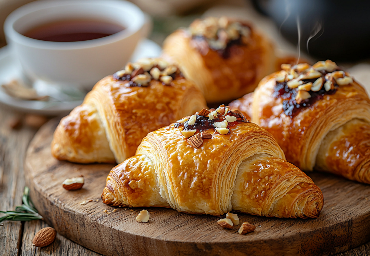 - Разрезать каждый круг на 8 треугольников. На широкую часть каждого треугольника выложить начинку: кусочки шоколада, измельченные орехи или варенье. Свернуть рогалики от широкого края к узкому. Выложить на противень, застеленный пергаментом, смазать взбитым яйцом. Выпекать в разогретой до 180 °C духовке 20–25 минут до золотистого цвета. Приятного аппетита!