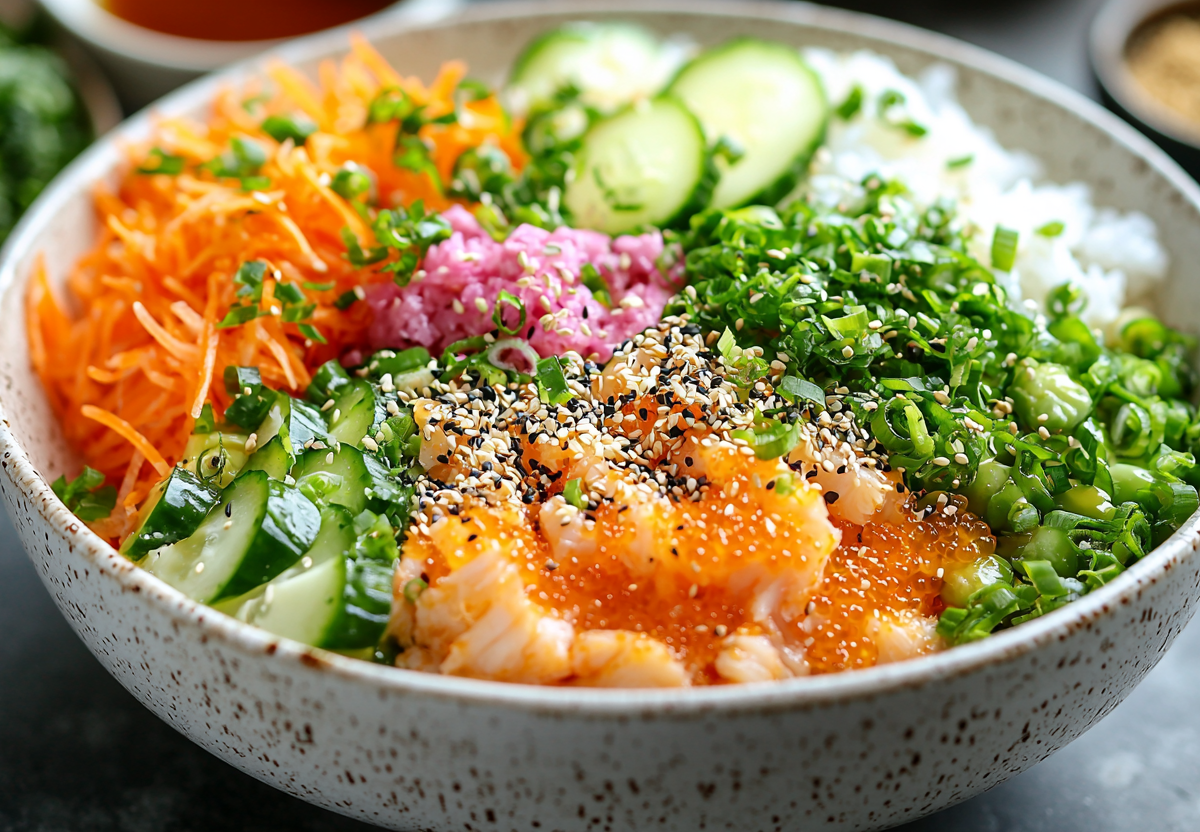 Крабовые палочки нарезаю тонкими кружочками или разбираю на волокна. Огурец нарезаю тонкой соломкой или с помощью овощечистки создаю длинные ленты. Морковь натираю на терке для корейской моркови или нарезаю очень тонкой соломкой. В небольшой сухой сковороде обжариваю панировочные сухари панко до золотистого цвета — они должны стать хрустящими, но не подгореть. Готовлю заправку: смешиваю майонез, соевый соус, рисовый уксус и шрирачу. Вместо майонеза можно использовать греческий йогурт для более легкого варианта. В миске соединяю крабовые палочки, огурец и морковь. Заправляю соусом и аккуратно перемешиваю. Сверху посыпаю поджаренным панко, кунжутными семенами и выкладываю икру тобико. Подаю сразу же, чтобы панко сохранило свою хрустящую текстуру.