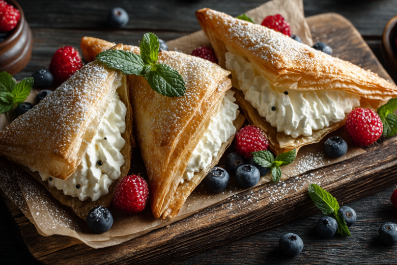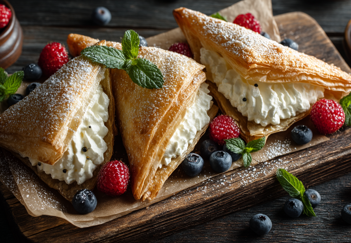 Хрустящее слоеное тесто в форме треугольников, запеченное до золотистого цвета, и нежный, воздушный крем из сливок и сливочного сыра создают идеальное сочетание.