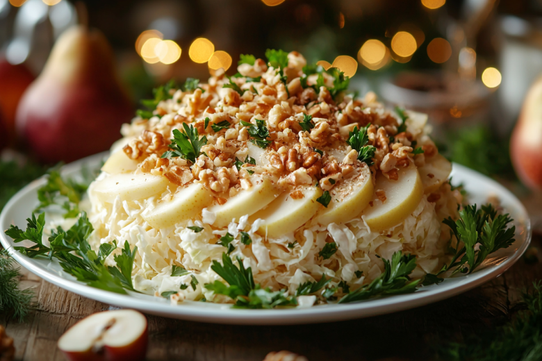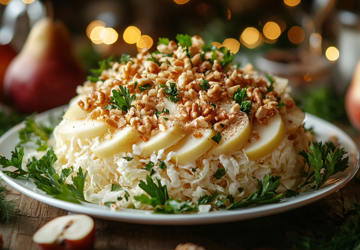 Вкус получается контрастным и изысканным: свежая хрустящая капуста, солоноватая и ароматная копченая курица, сочная сладковатая груша и пикантные орехи создают идеальное сочетание текстур и вкусов.