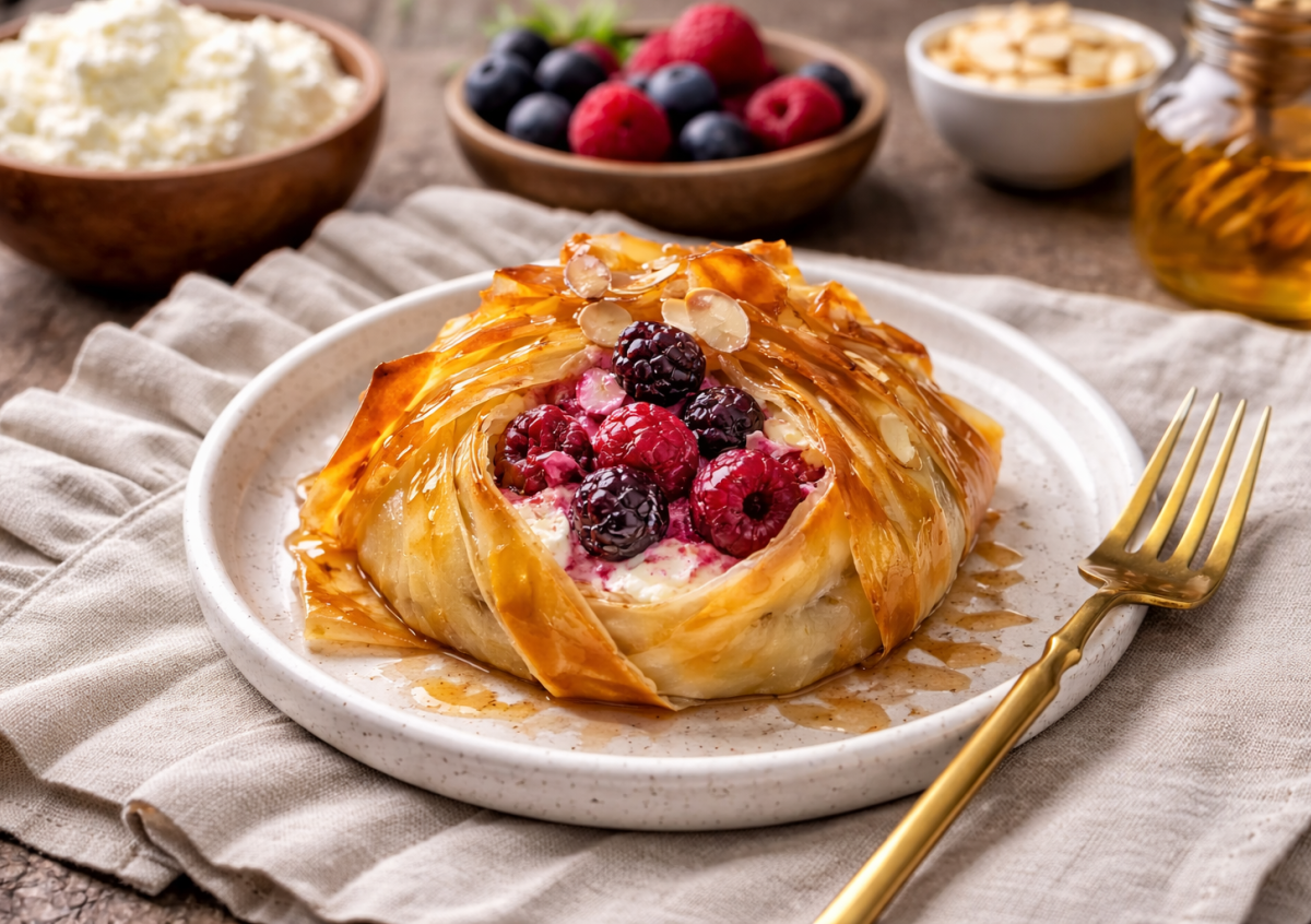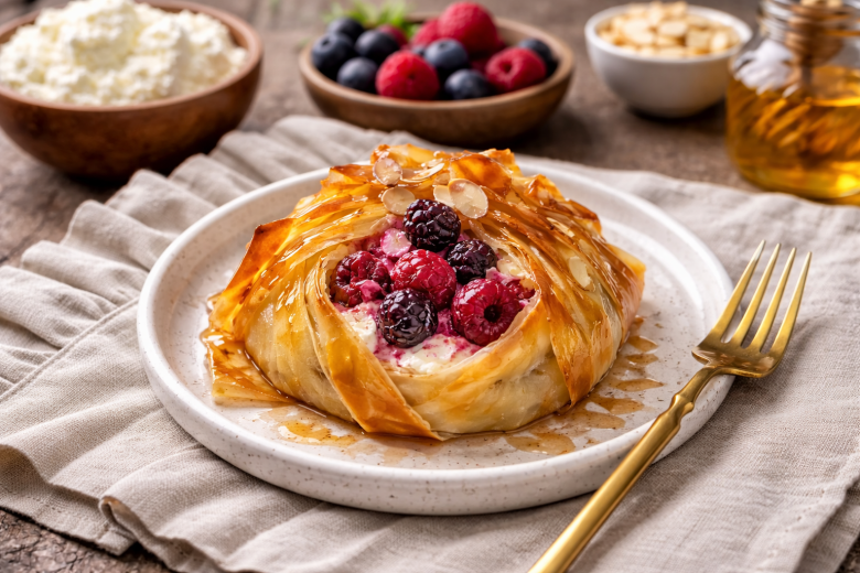 Ингредиенты: тесто фило — 4–6 листов, сливочное масло — 50 г, творог — 200 г, любая замороженная ягода — 150 г, сахар или сахарная пудра — 2–3 ст. л., миндальные лепестки — 20 г, мёд — 2 ст. л.