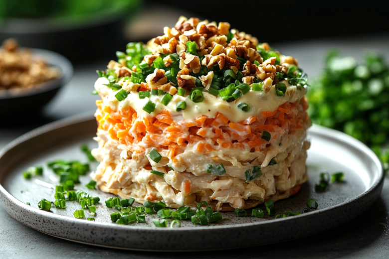 Этот салат — смелая и очень удачная интерпретация знаменитого грузинского супа, превращённая в сытное самостоятельное блюдо. Он сочетает в себе насыщенный, пряный аромат харчо, нежность долго томившейся говядины и сытность риса. Грецкие орехи и зелень добавляют ему характерную фактуру и свежесть. Это не просто салат, а настоящее гастрономическое путешествие, которое согреет, накормит и подарит ощущение щедрого семейного застолья даже в будний вечер.