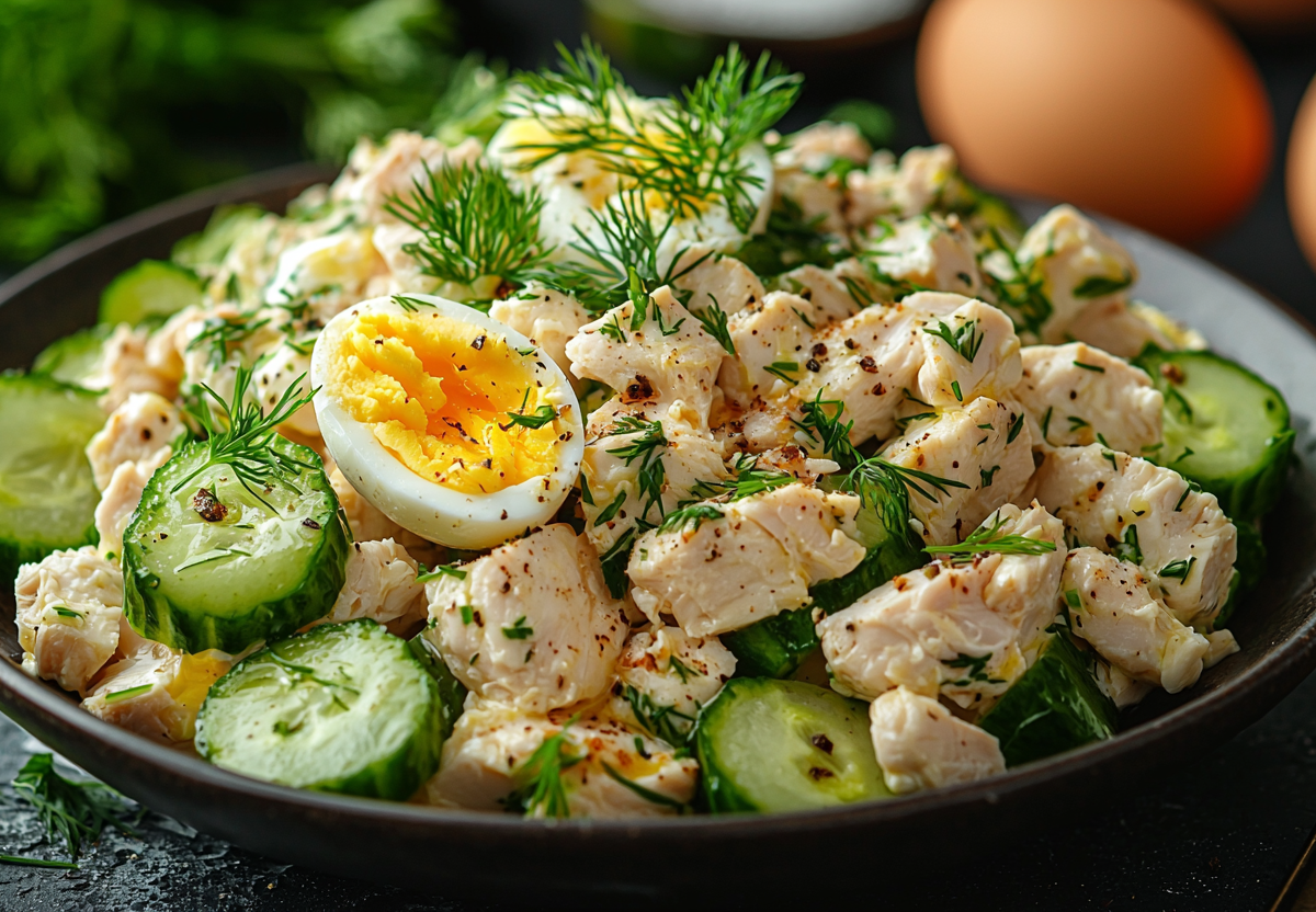 Белое мясо курицы отварить или приготовить на пару, яйца сварить вкрутую. Мясо, яйца и огурец порезать мелкими кубиками. Если вы решили добавить морковь, то ее тоже необходимо отварить и измельчить ножом. Укроп мелко порезать. При желании добавить горошек — остудить его после отваривания. Все ингредиенты смешать и убрать в холодильник на пару часов, чтобы салат пропитался.