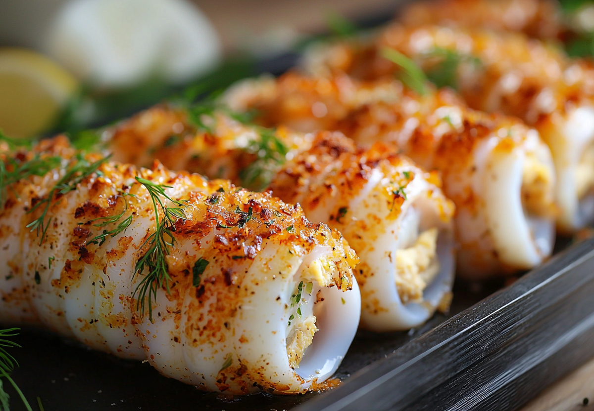 Вам понадобятся 2 большие тушки кальмаров, 200 г крабовых палочек, 3 вареных яйца, 100 г твердого сыра, пучок укропа, 3 ст. л. майонеза, соль и перец по вкусу. Кальмаров очистите, обдайте кипятком и промокните бумажным полотенцем. Крабовые палочки нарежьте мелкими кубиками. Яйца и сыр натрите на средней терке. Укроп мелко порубите. Смешайте все ингредиенты для начинки с майонезом, посолите и поперчите. Аккуратно наполните тушки кальмаров полученной смесью, не утрамбовывая слишком плотно. Выложите фаршированных кальмаров в форму для запекания, слегка смазанную маслом. Запекайте в разогретой до 180 °C духовке 20–25 минут до золотистой корочки. Дайте немного остыть, затем нарежьте кольцами и подавайте с лимоном и свежей зеленью.