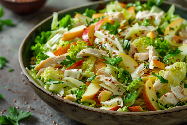 Знаете, какой салат может стать настоящим открытием для тех, кто устал от сложных многослойных закусок? «Борзая тройка» — тот самый случай, когда всего три продукта создают настолько гармоничный и насыщенный вкус, что сложно поверить в простоту рецепта. Хрустящая пекинская капуста, сочное яблоко с приятной кислинкой и ароматная копченая курица — это сочетание, которое не нуждается в дополнениях. А легкая заправка на основе греческого йогурта с лимоном и льняными семечками добавляет блюду пикантности и пользы. Этот салат — доказательство того, что настоящая вкуснота часто скрывается за простотой.