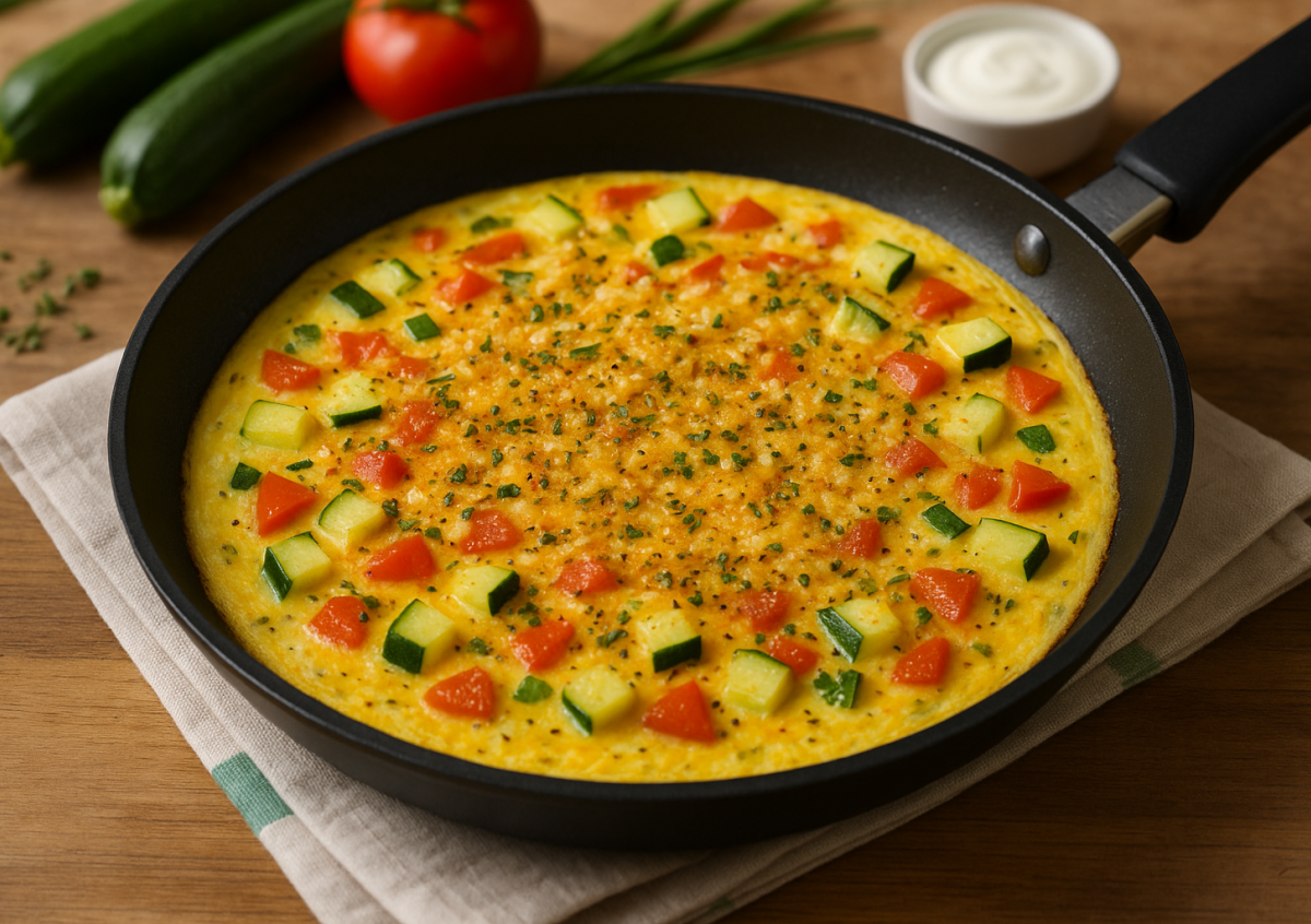 Кабачок и помидор режем кубиками, смешиваем со взбитыми яйцами и специями. Выливаем на сковороду, готовим 15–20 минут под крышкой. Посыпаем сыром, даем ему расплавиться — и вуаля! Сытный завтрак, обед или ужин готов без лишних усилий.
