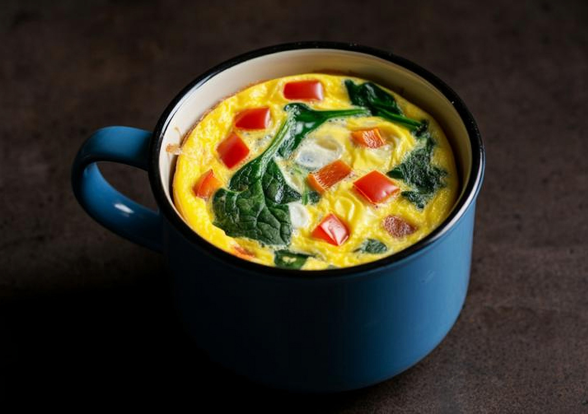 Добавляем выбранные ингредиенты (примерно 2–3 ст. л. начинки), перемешиваем и ставим в микроволновку на 2 минуты при мощности 800 Вт. Если омлет недостаточно пропекся, добавляем по 20 секунд до готовности.