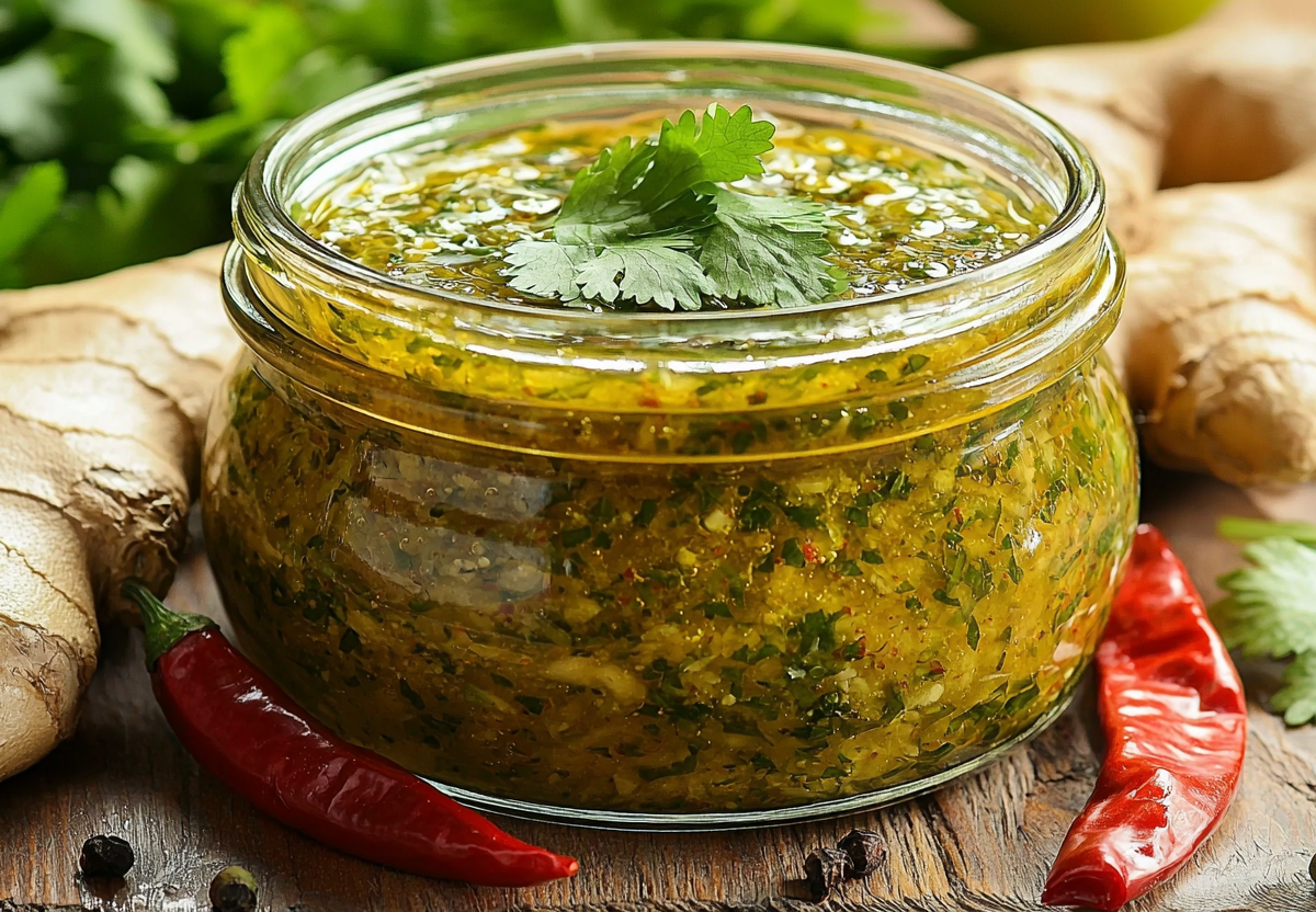 В стерильную банку выкладываем мелко порубленные стебли и корешки кинзы (тщательно промытые от песка!). Добавляем сок, отжатый из тертого имбиря (кусочек 3 см) — мякоть не используем. Режем 1 красный чили тонкими колечками (семена оставляем для остроты или убираем для мягкого варианта).