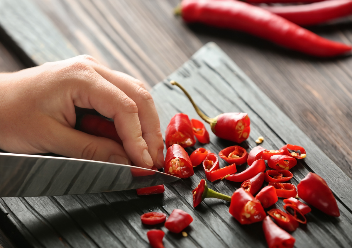 Не забудьте после того, как нарезали жгучий перец, тщательно промыть с моющим средством, а затем ополоснуть прохладной водой разделочную доску и нож. В остром перце содержится жгучее вещество капсаицин, которое при случайном попадании в глаза, а также в больших количествах на слизистые может вызвать аллергическую реакцию.