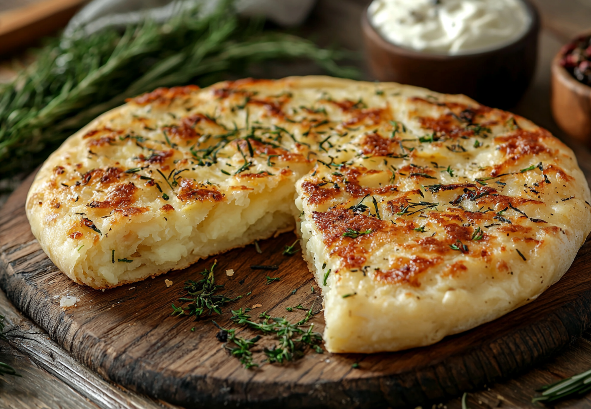 Готовая лепешка порадует слоистой текстурой, сливочным вкусом картофеля и ароматом свежей выпечки. Это блюдо заменит и хлеб, и гарнир! Для пикантности добавьте в начинку обжаренный лук или тертый сыр.